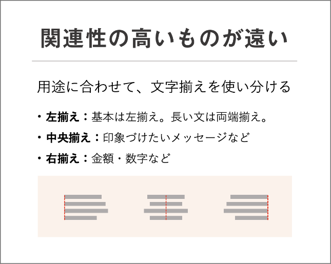 近くに配置されているもの同士は「関連性があるもの」、離れて配置されているものは「関連性がないもの」に感じます。